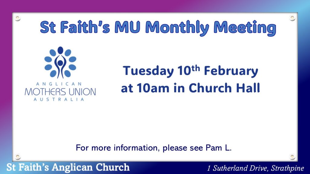 St Faith’s at Strathpine is proud to have our own branch of Mother’s Union within the Dioceses of Brisbane. Check out the Diocese of Brisbane website for more information on Mother’s Union. Diocese of Brisbane – Anglican Mothers Union Australia (muaustralia.org.au)