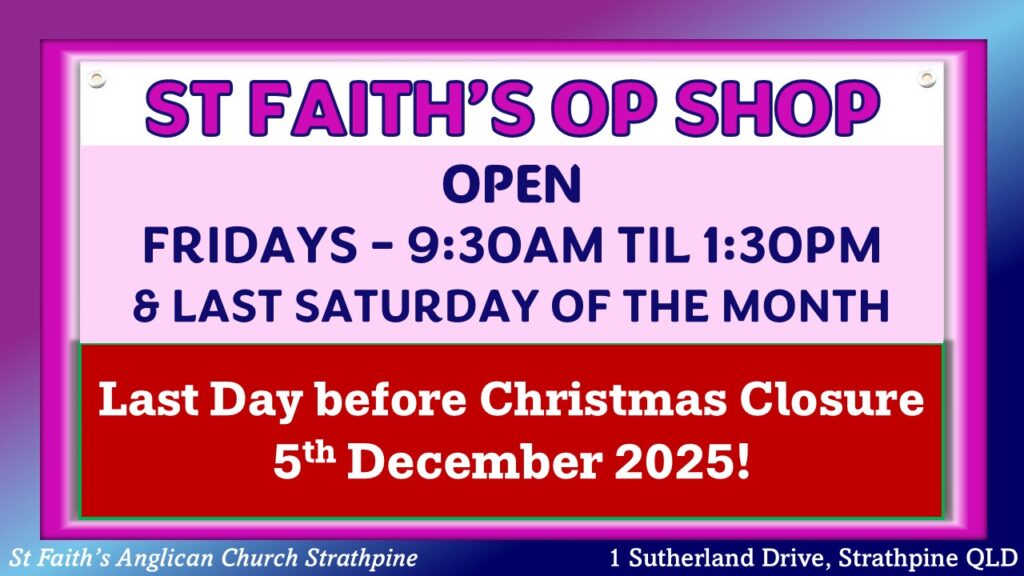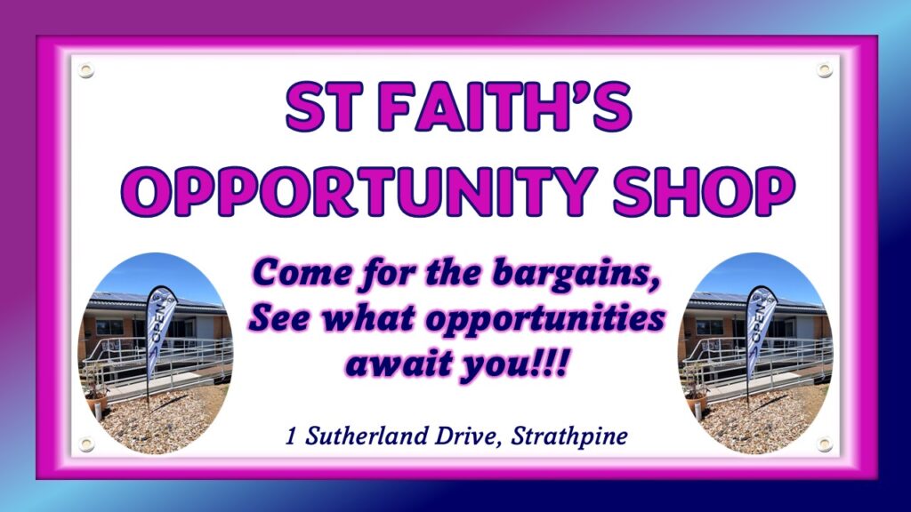 In late October 2022 the vision of having an Opportunity Shop here at St Faith’s became a reality thanks to the hard work of a group of parishioners who saw this project through to the doors being opened. Opening the Opportunity Shop has given St Faith’s yet another way to serve the community and Neighbours. We stock a range of things from Clothing – Men, Womens & Children, Accessories – Bags, Shoes, Scarves etc., Homewares – glassware, Craft, Books, Games, Toys and a few miscellaneous items. You just never know what you will find at the Op Shop.